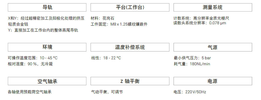 • 三轴导轨均采用高精度自洁式空气轴承,运动更平稳,导轨不易磨损。
