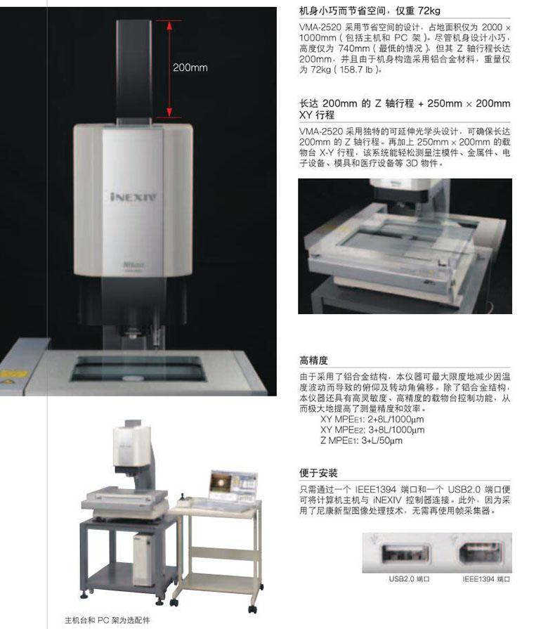新款iNEXIVVMA-2520专为测量三维工件而设计。尽管本仪器小巧轻盈,仍然具有长达200mm的Z轴行程和73.5mm的工作距离,能十分方便地对机械部件、注塑模件、金属冲压件、电子设备、模具和医疗设备进行Z轴测量。标准的10倍变焦光学系统符合“高放大倍率时具有极高的分辨率,低放大倍率时具有广阔的视场”这一严苛的行业要求。低失真光学系统和高光强白色LED照明光源增强了对比度,提高了仪器的测量效率。即便对于带有多种颜色的部件,这样的设计组合仍能确保实现可重复测量。